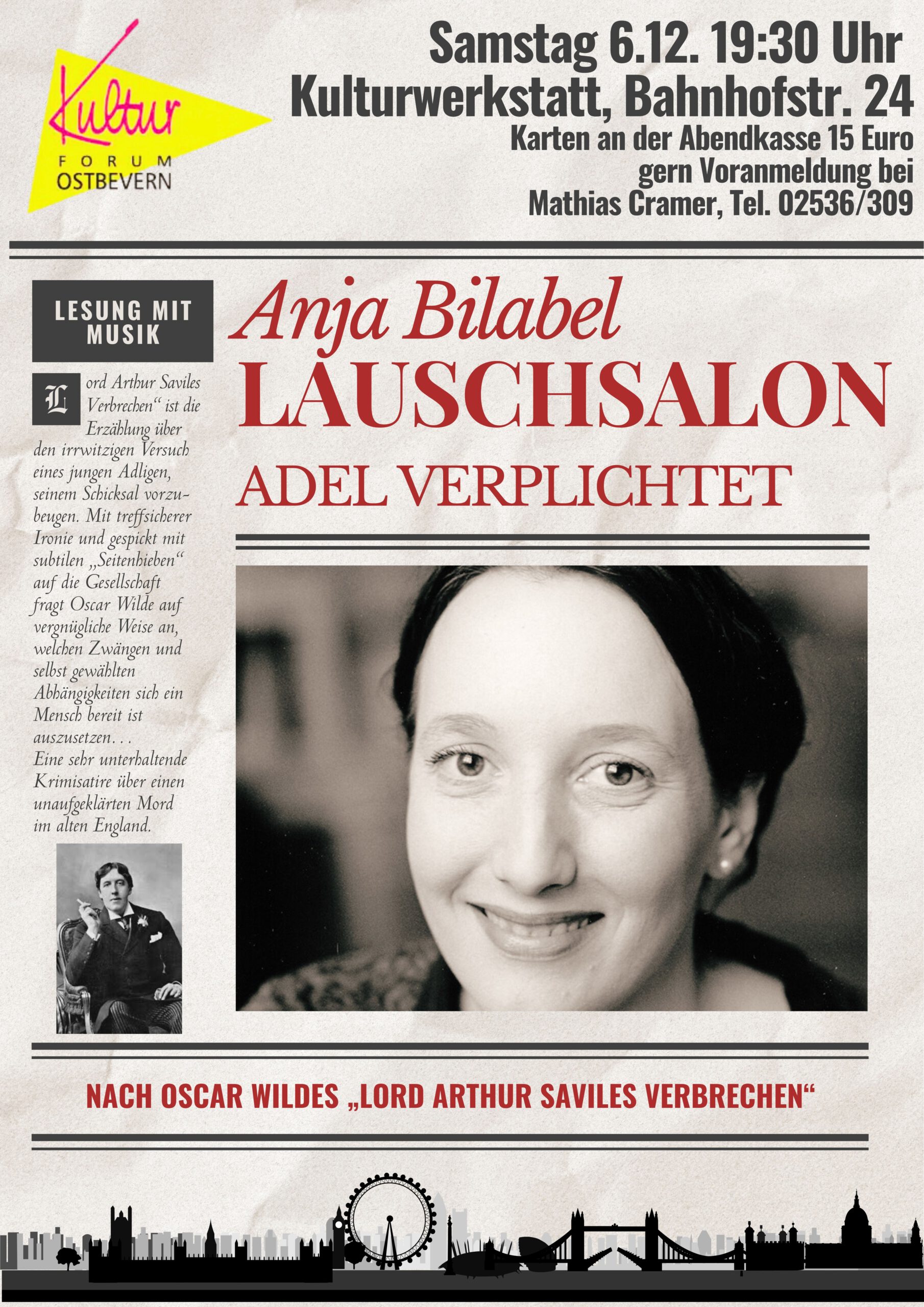 Kulturwerkstatt Bahnhofstraße 24, OstbevernOscar Wilde: „Das Verbrechen des Lord Arthur Savile“ oder „Adel verpflichtet!“ Inhalt: Der junge Lord Arthur bekommt kurz vor seiner Hochzeit prophezeit, dass er in seinem Leben einen Mord begehen …